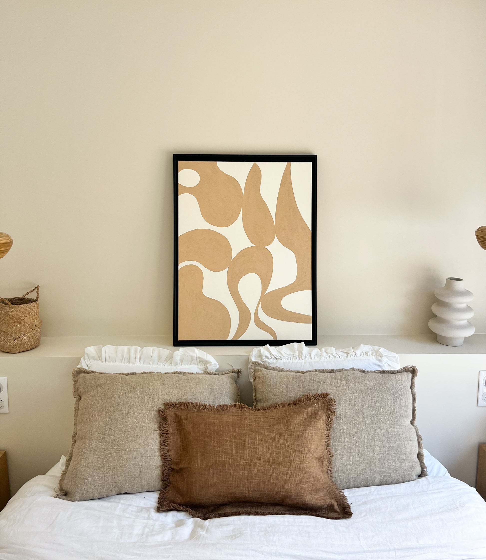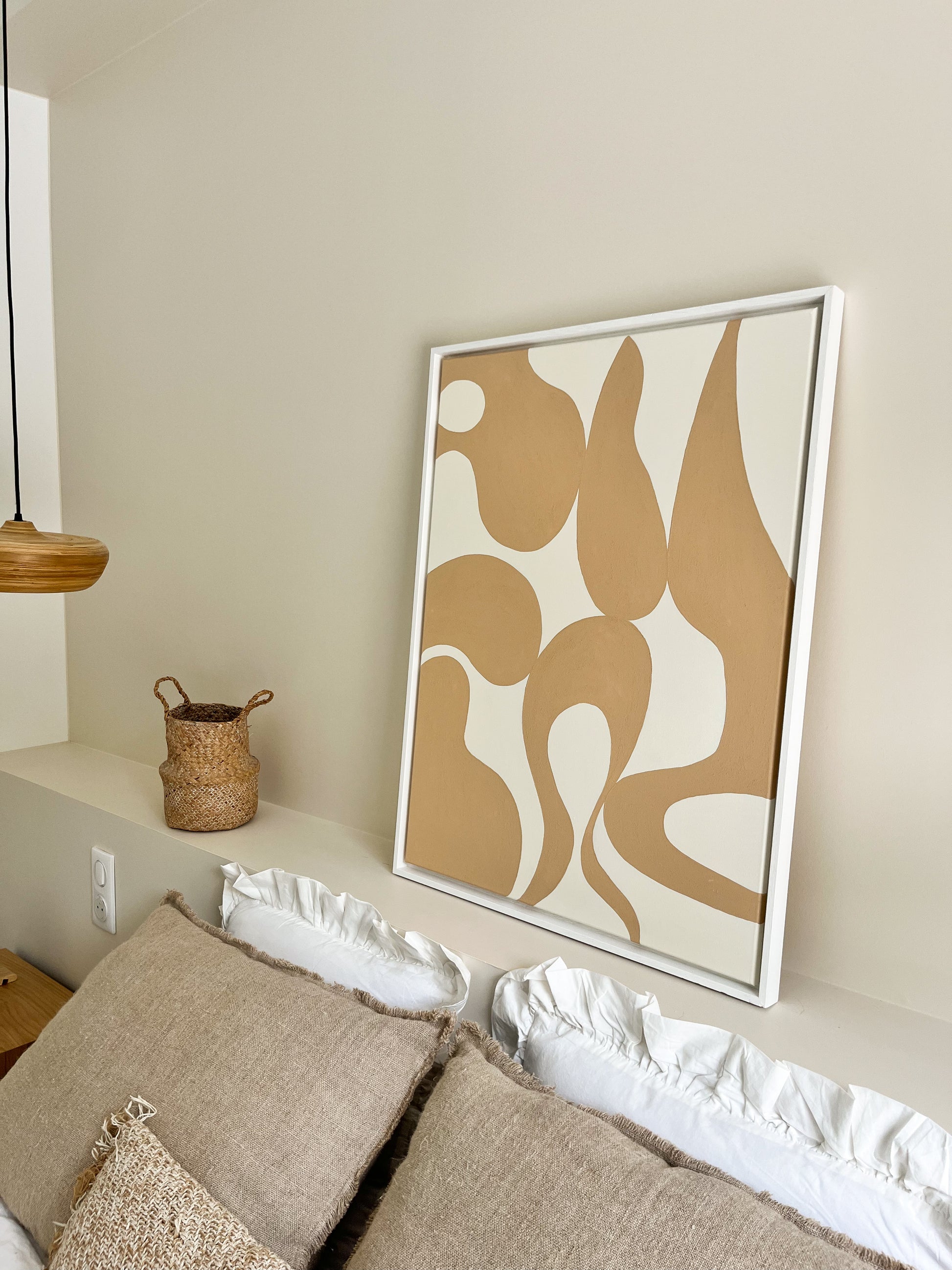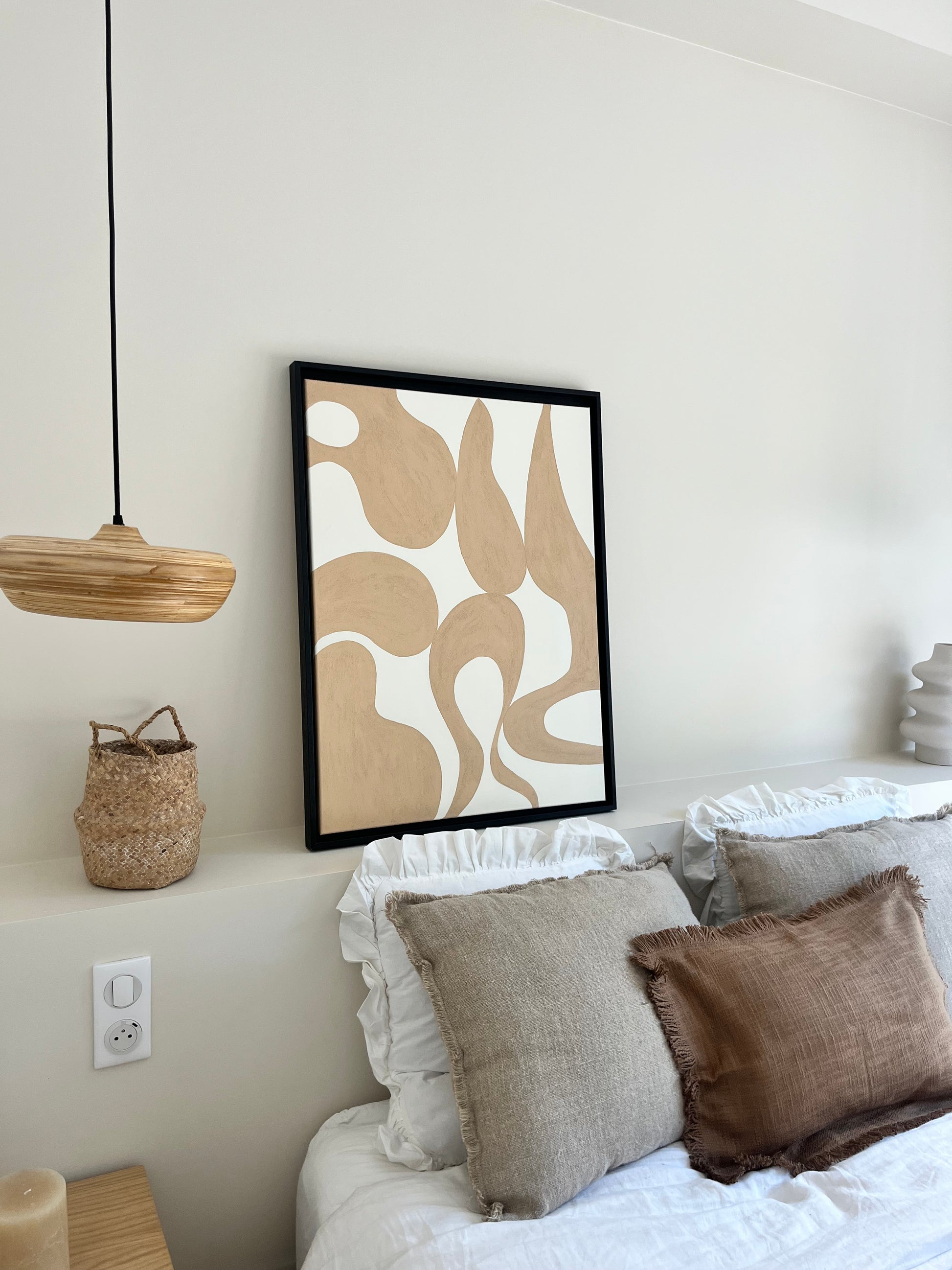 Découvrez ce tableau aux formes organiques marron clair grainé avec un fond crème, pensé par la créatrice de Moodéa pour apporter des motifs abstraits et chaleureux à une décoration. Ce tableau représente plusieurs motifs géométriques, tous à la texture grainée avec un effet sableux qui se perçoit sous une source de lumière.