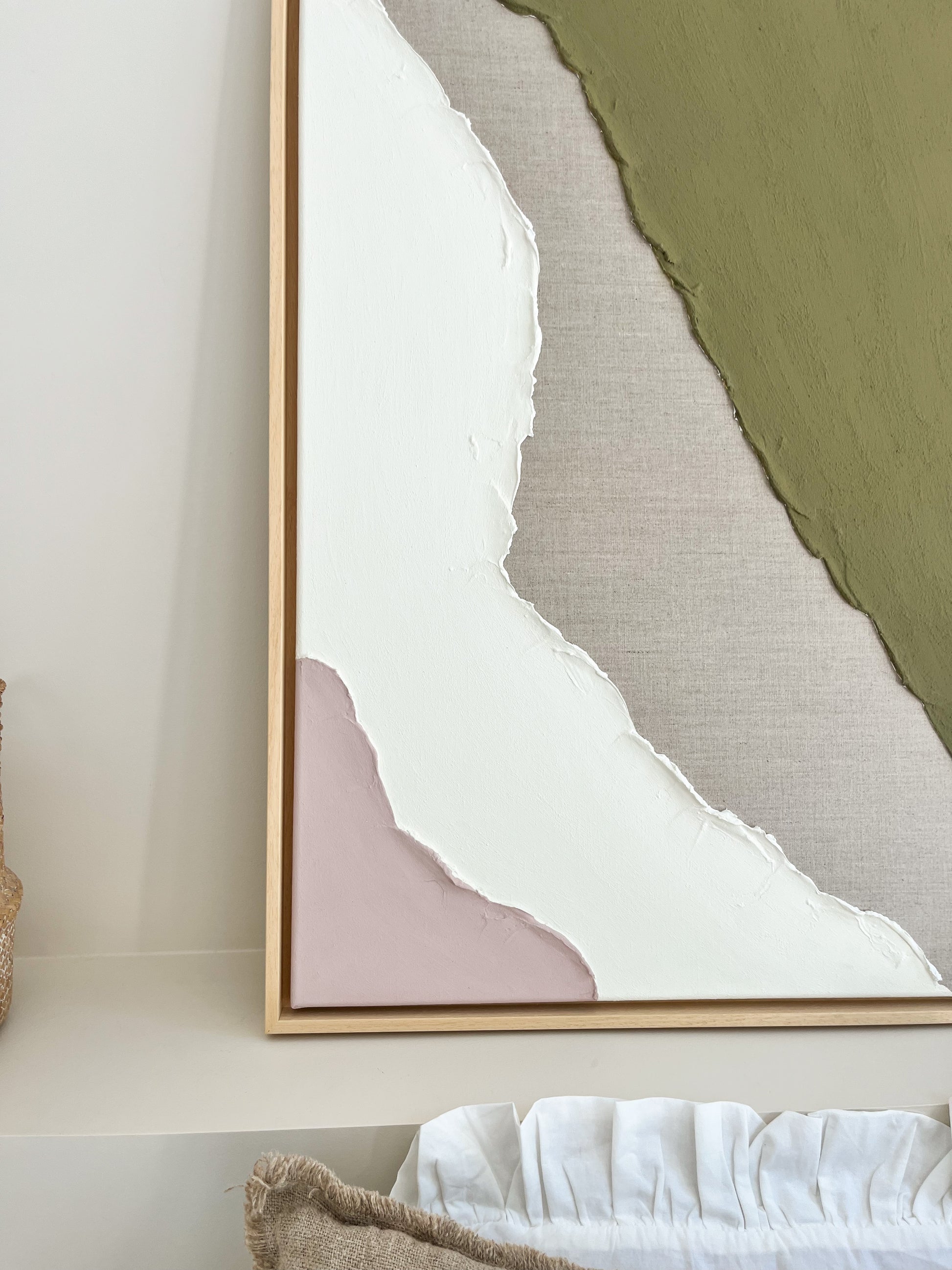 Découvrez le relief intense et coloré de ce tableau vert kaki, rose pale, et crème, le tout sur une toile en lin. Ce tableau aux reliefs minimalistes apportera de la luminosité et de la profondeur à votre pièce. Il est idéal pour créer un intérieur épuré et minimaliste, tout en ajoutant une touche colorée à votre décoration.