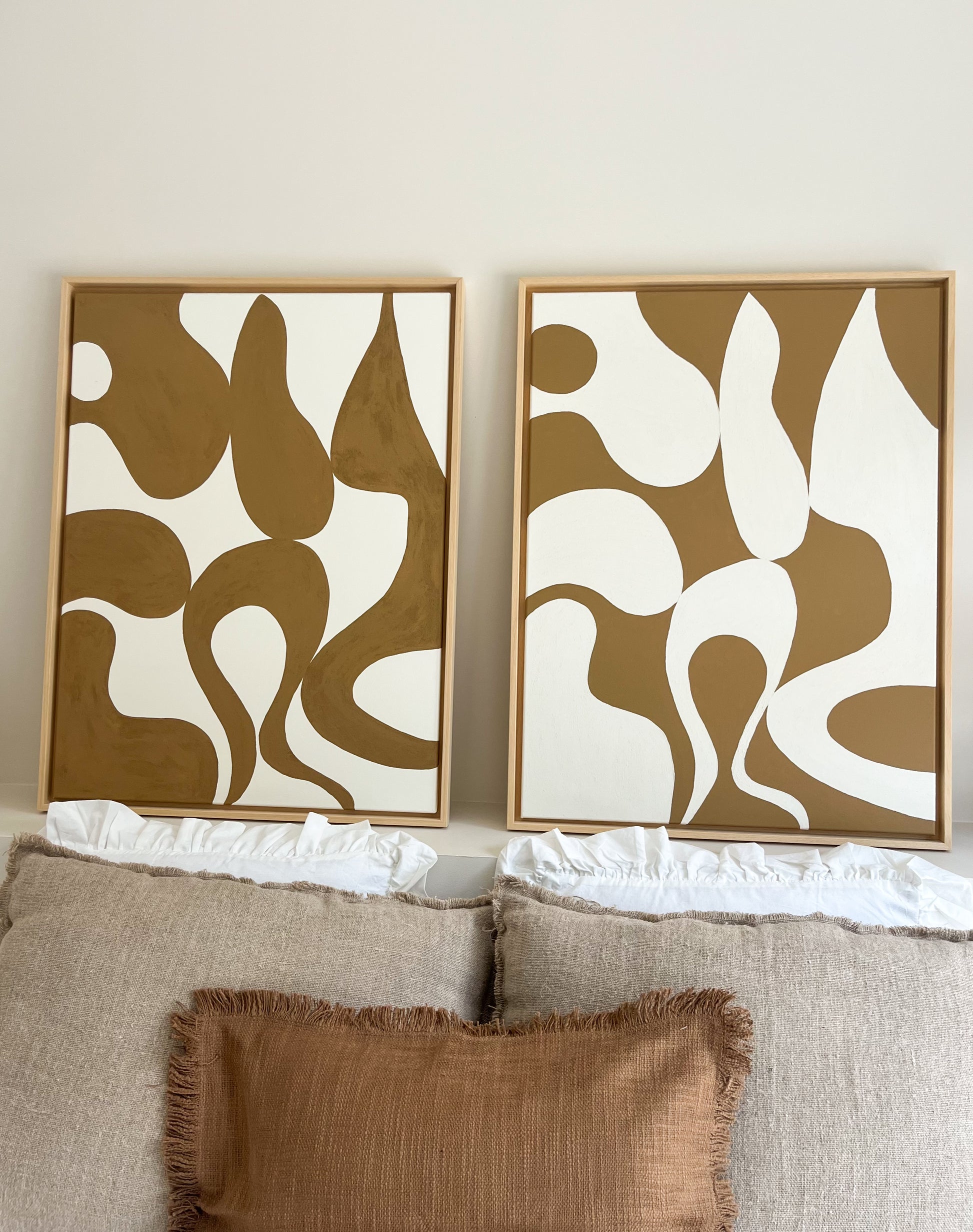 Découvrez ce DUO de tableaux aux formes organiques marron camel et crème, pensés par la créatrice de Moodéa pour apporter des motifs abstraits et chaleureux à une décoration. Ces tableaux représentent plusieurs motifs géométriques, tous à la texture grainée avec un effet sableux qui se perçoit sous une source de lumière.