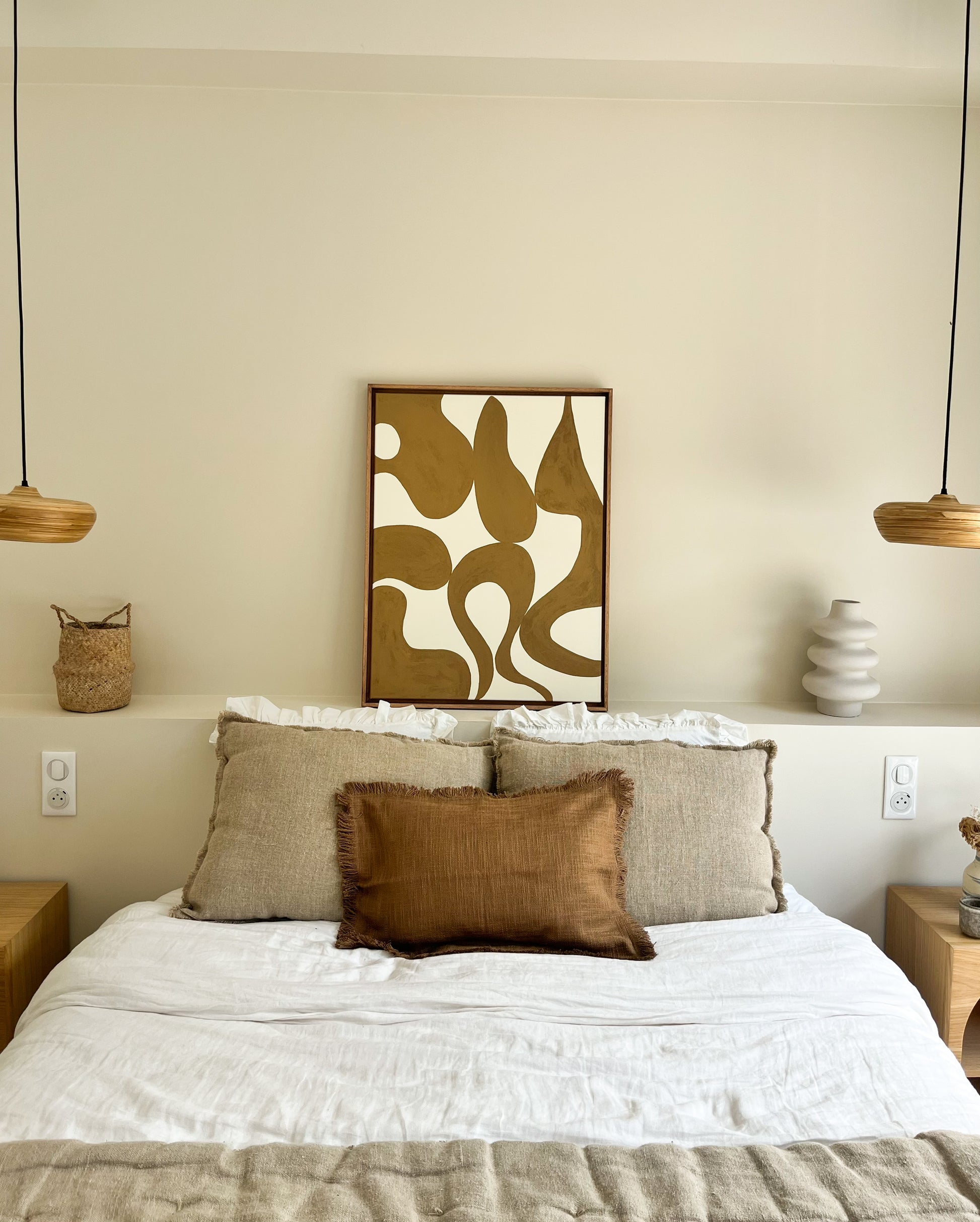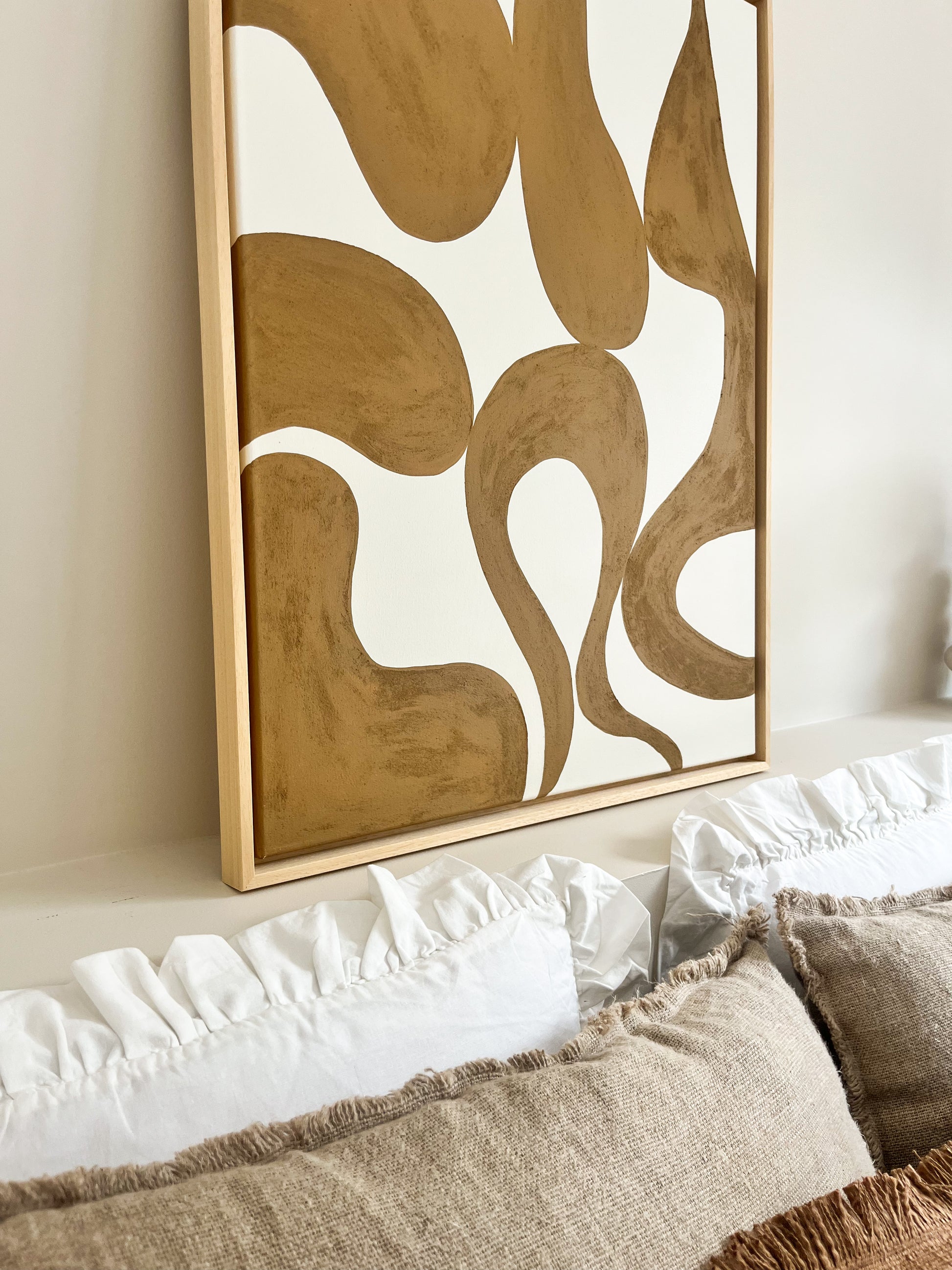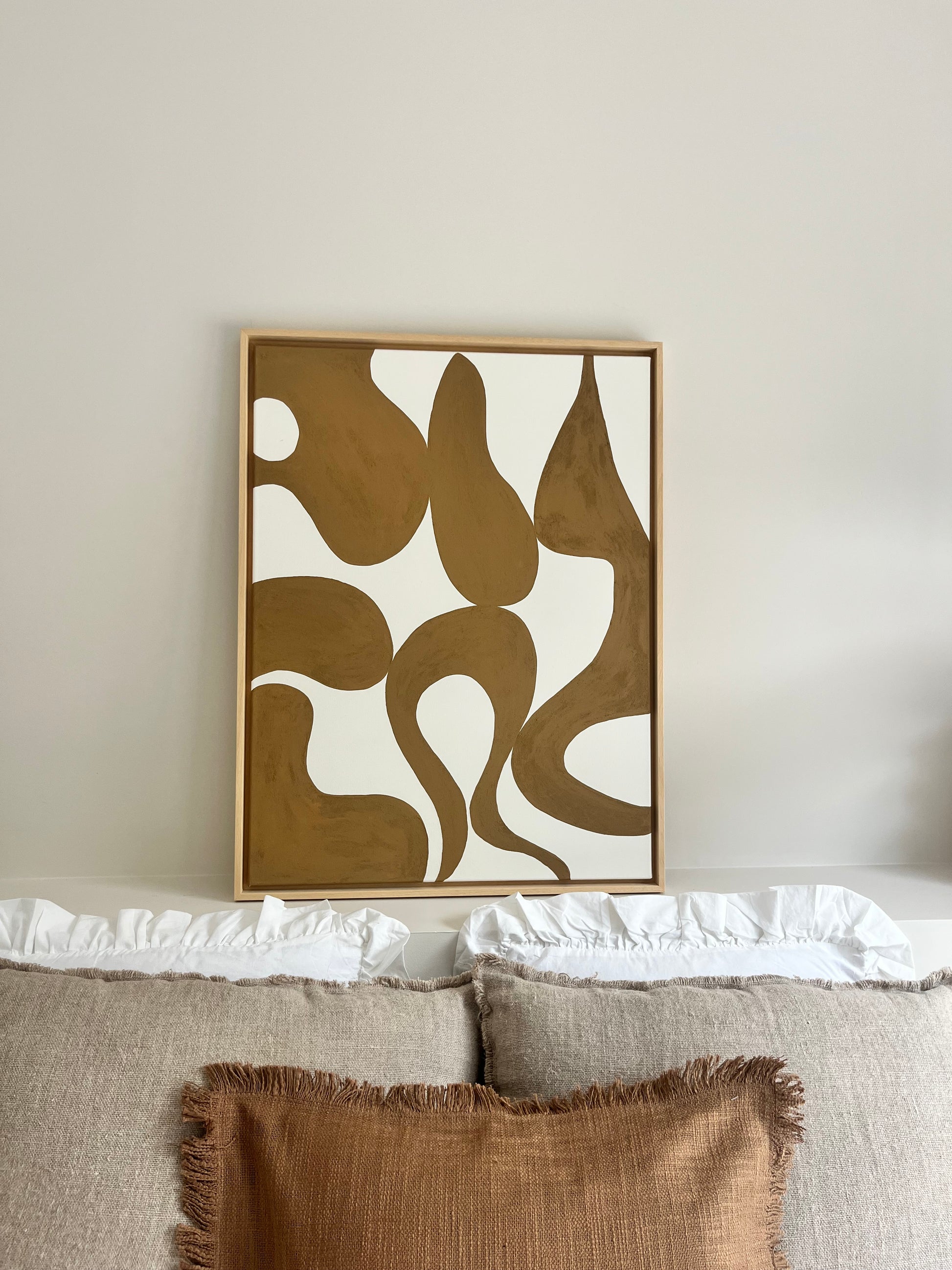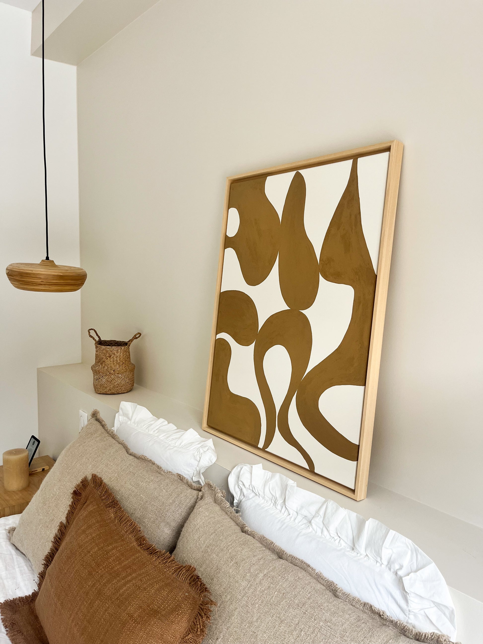 Découvrez ce tableau aux formes organiques marron camel, pensé par la créatrice de Moodéa pour apporter des motifs abstraits et chaleureux à une décoration. Ce tableau représente plusieurs motifs géométriques, tous à la texture grainée avec un effet sableux qui se perçoit sous une source de lumière.