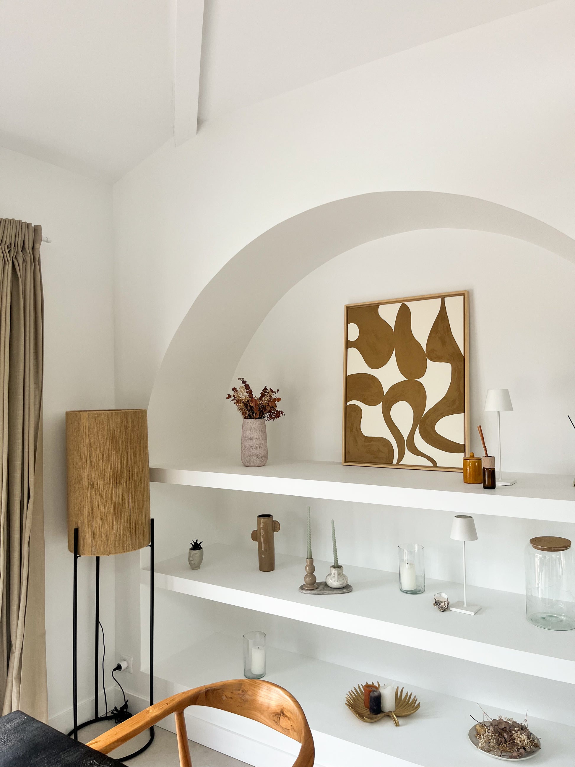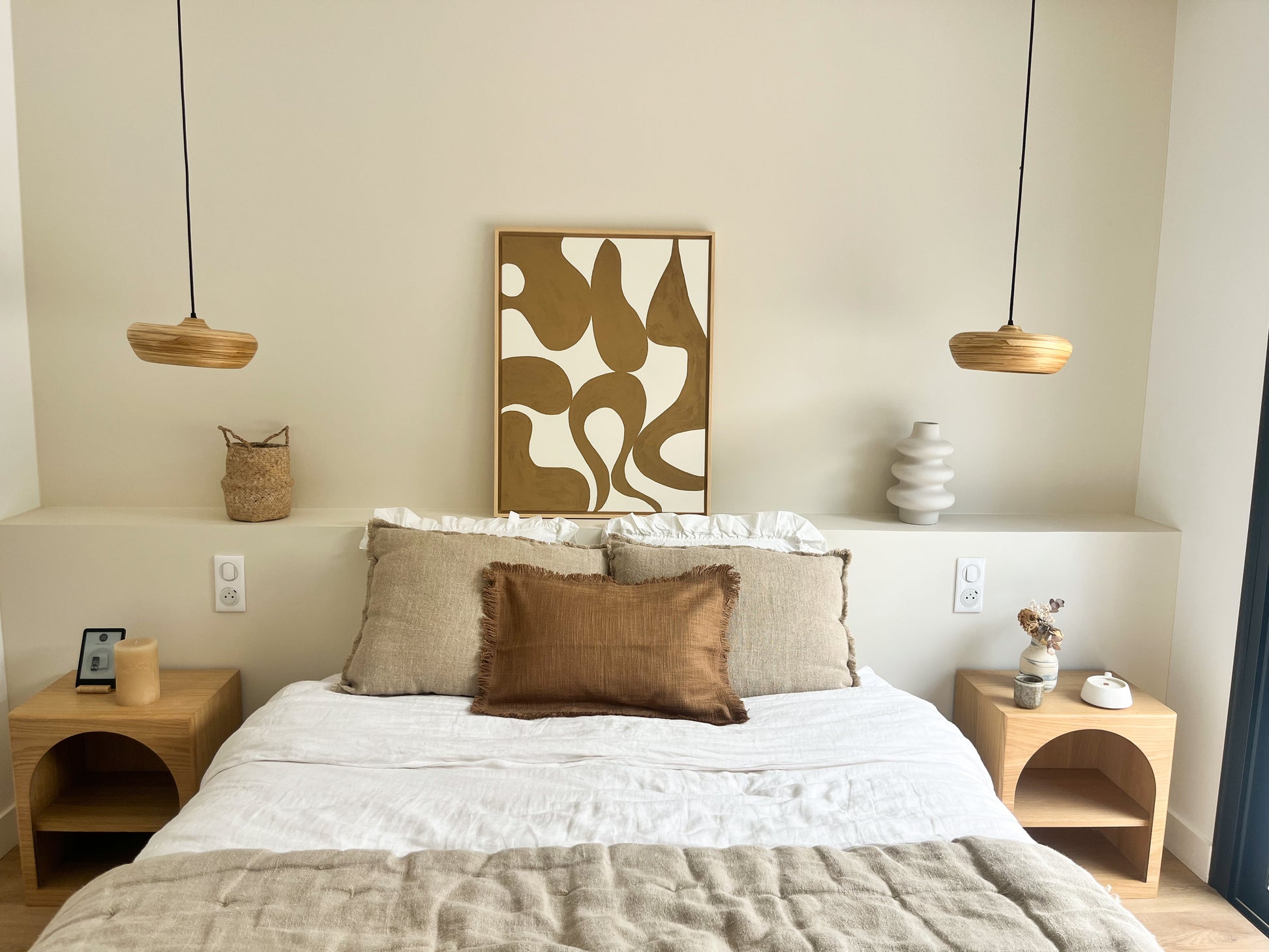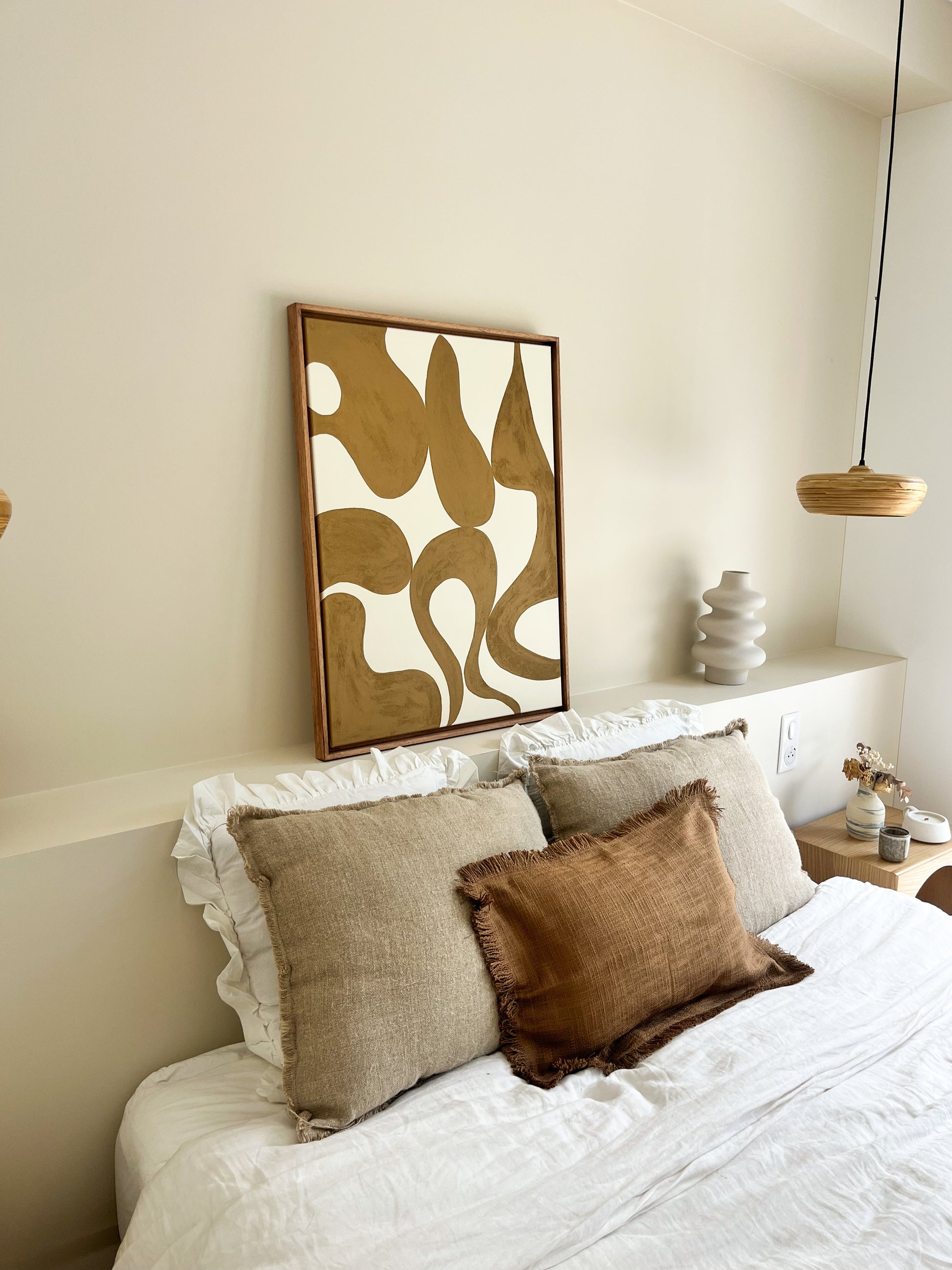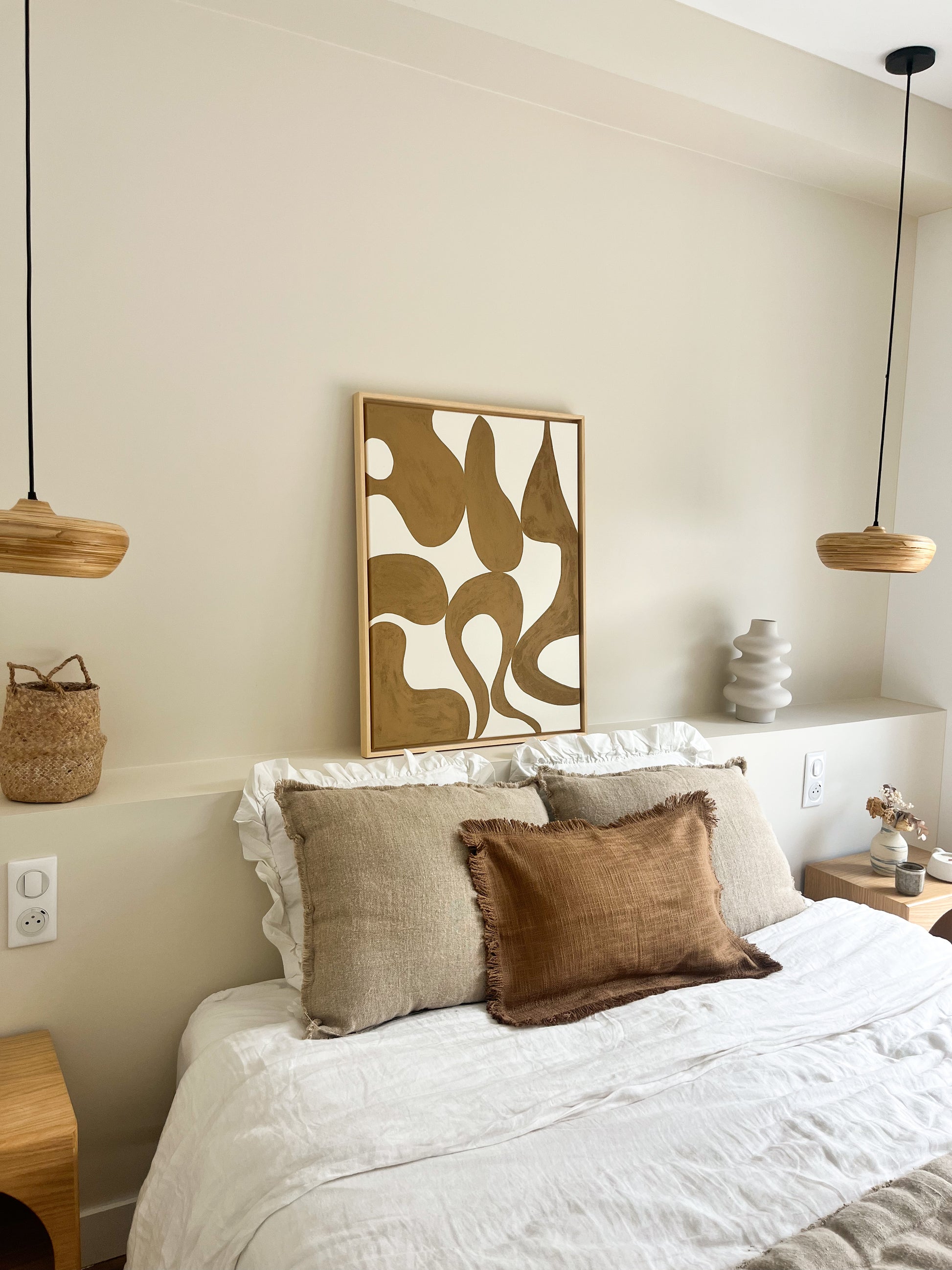 Découvrez ce tableau aux formes organiques marron camel, pensé par la créatrice de Moodéa pour apporter des motifs abstraits et chaleureux à une décoration. Ce tableau représente plusieurs motifs géométriques, tous à la texture grainée avec un effet sableux qui se perçoit sous une source de lumière.