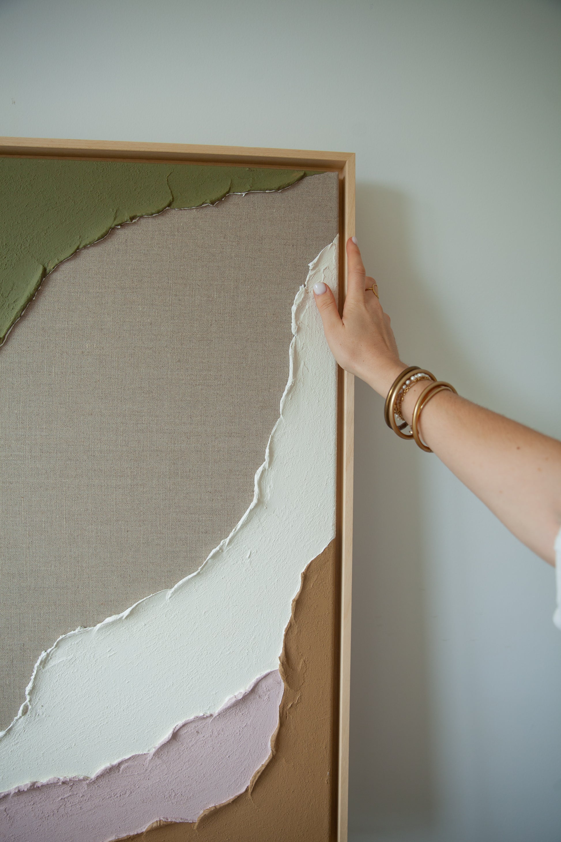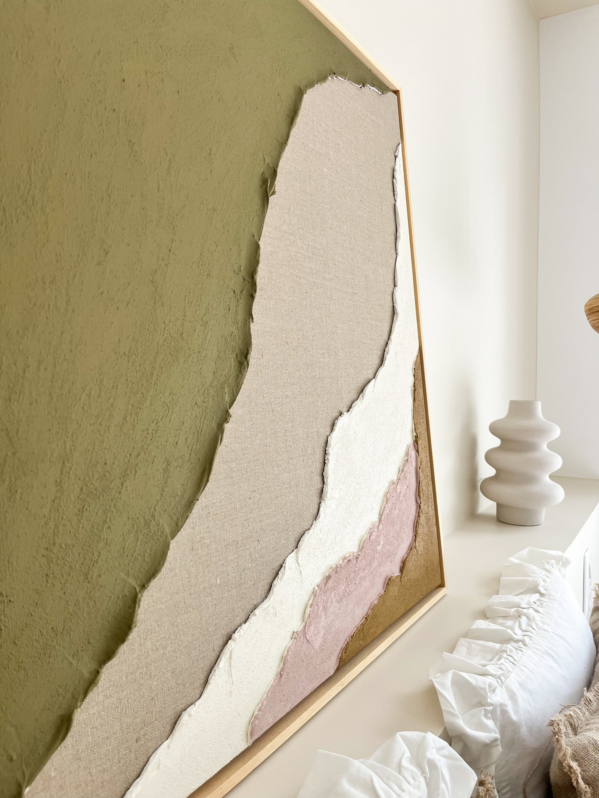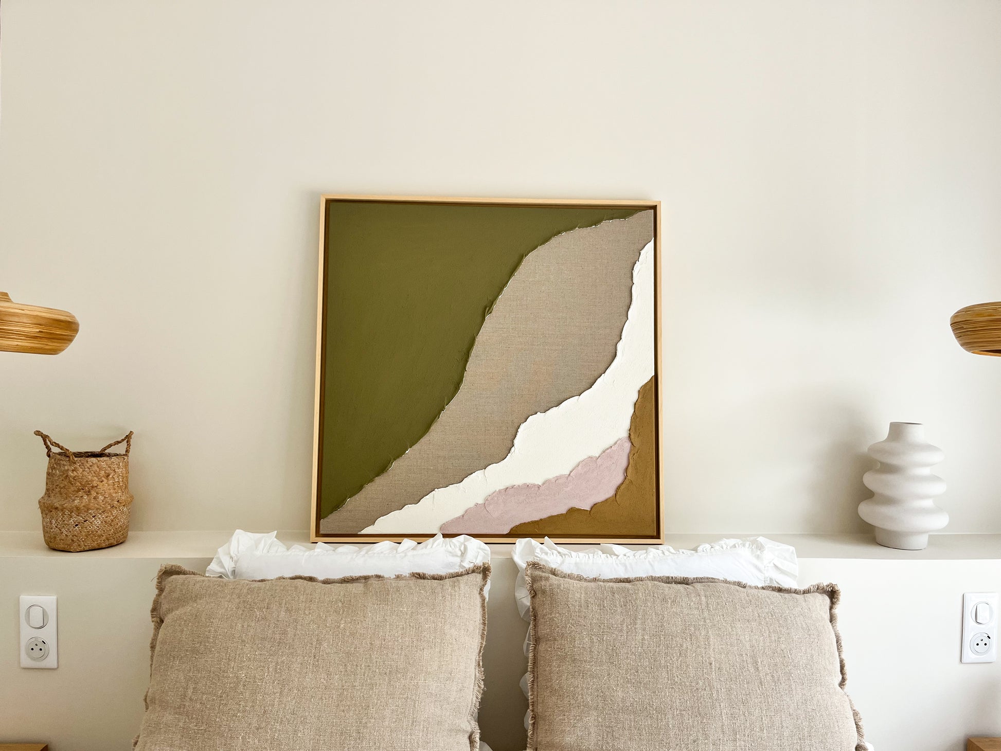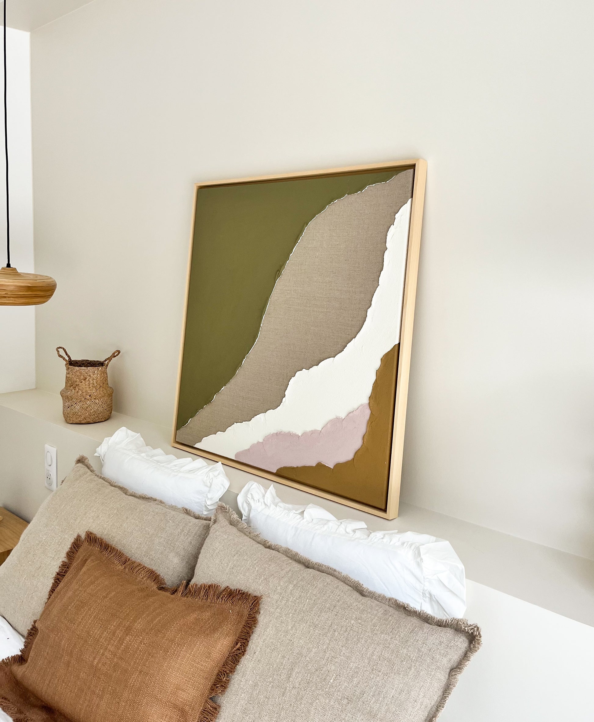 Découvrez le relief intense et coloré de ce tableau vert kaki, rose pâle, crème et camel, le tout sur une toile 100% lin. Ce tableau aux reliefs minimalistes apportera de la luminosité et de la profondeur à votre pièce. Il est idéal pour un intérieur épuré et minimaliste, tout en ajoutant une touche artistique à votre décoration.