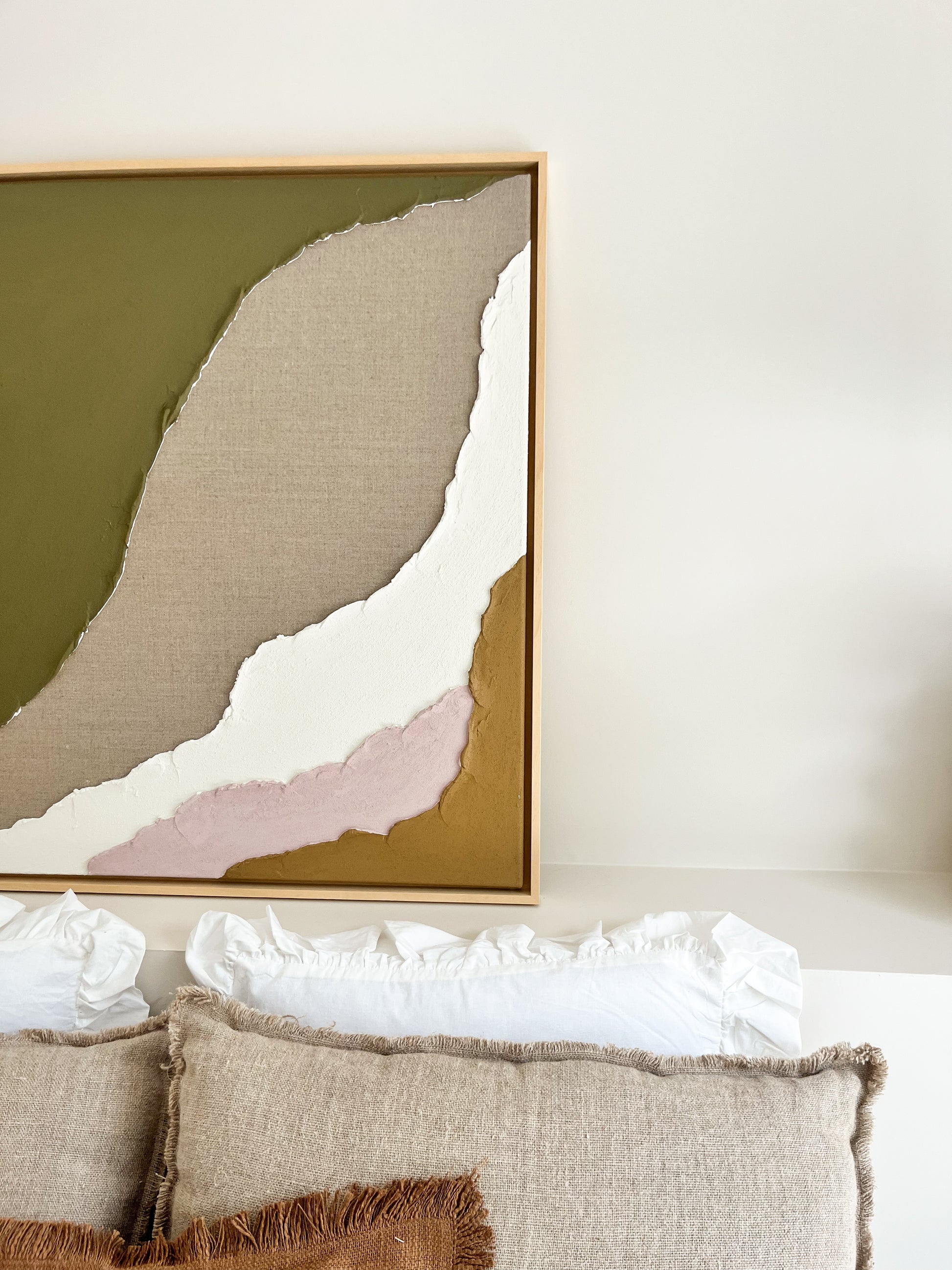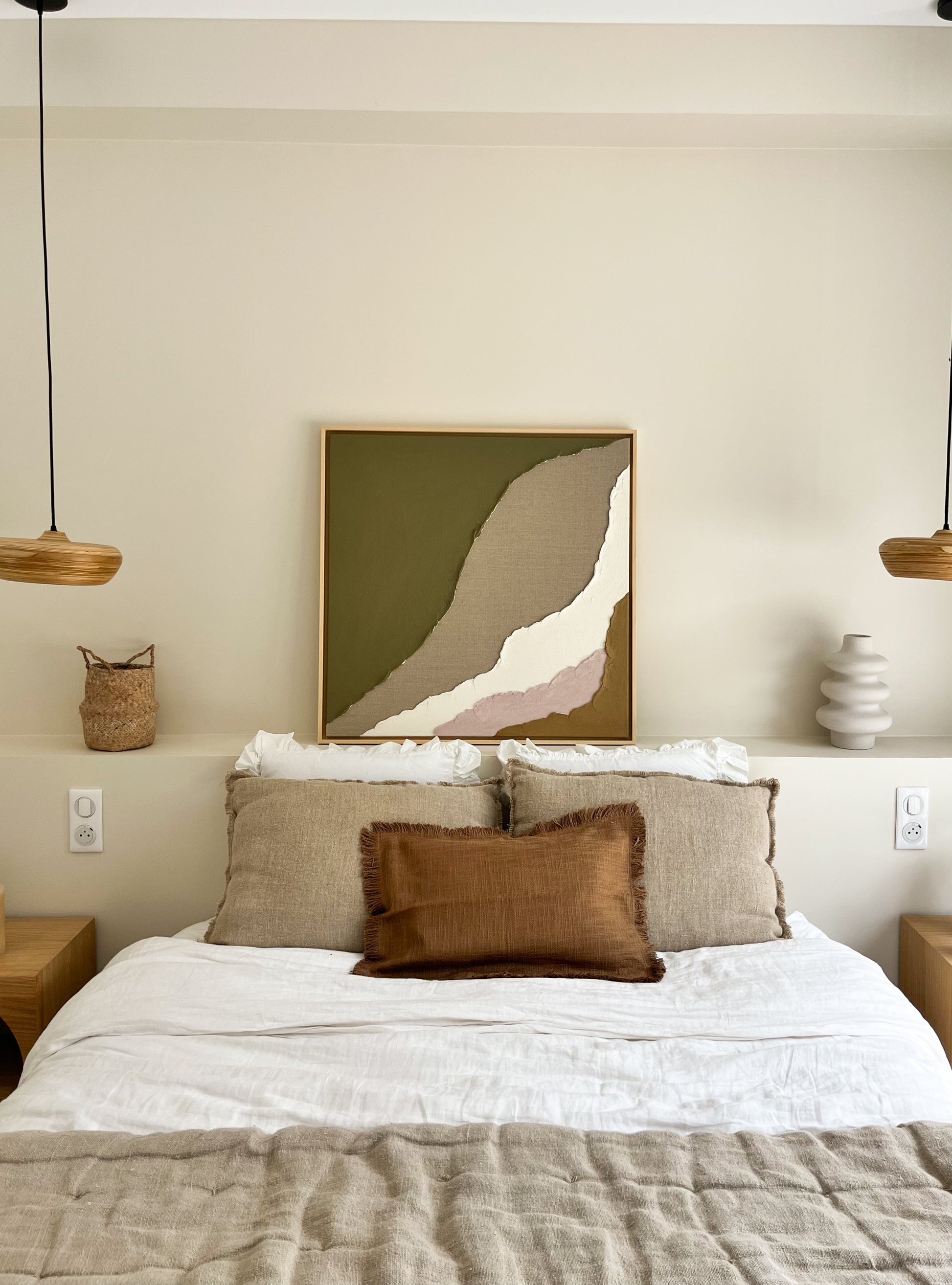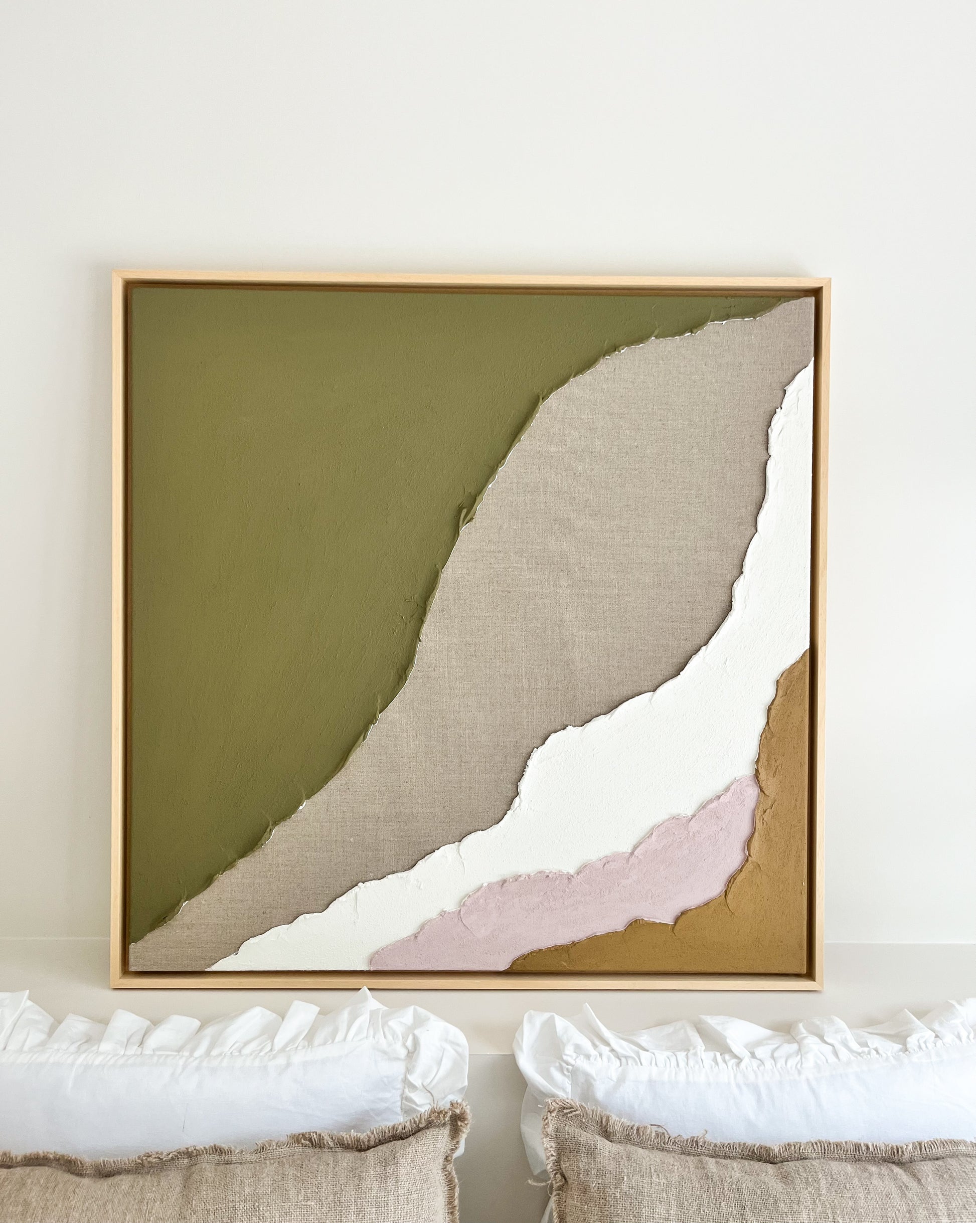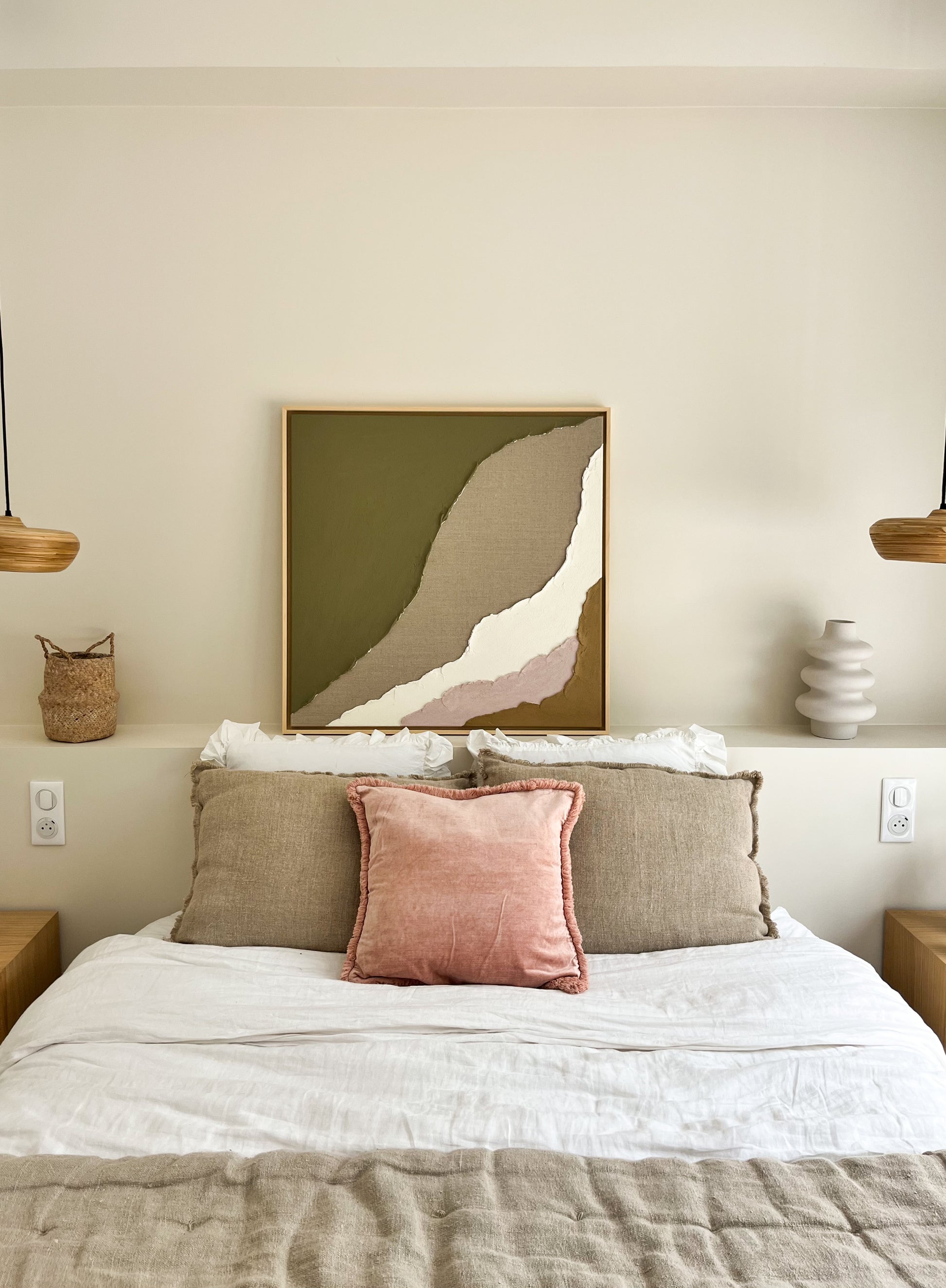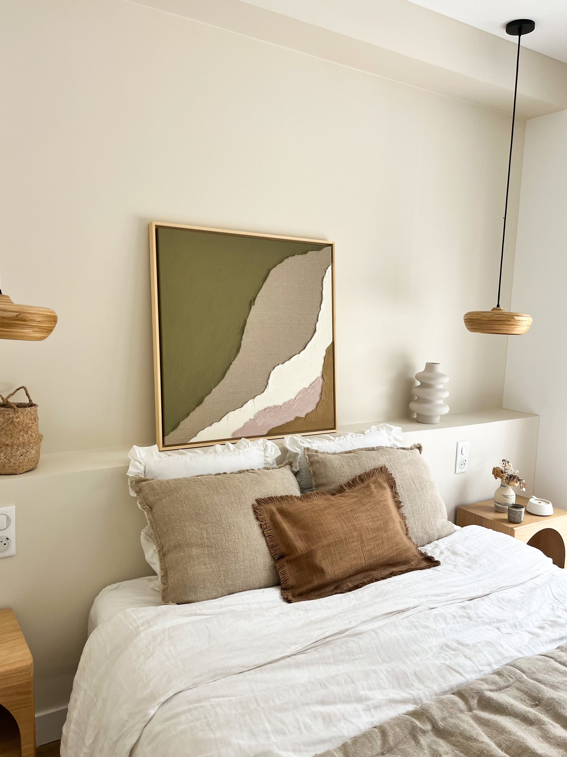 Découvrez le relief intense et coloré de ce tableau vert kaki, rose pâle, crème et camel, le tout sur une toile 100% lin. Ce tableau aux reliefs minimalistes apportera de la luminosité et de la profondeur à votre pièce. Il est idéal pour un intérieur épuré et minimaliste, tout en ajoutant une touche artistique à votre décoration.