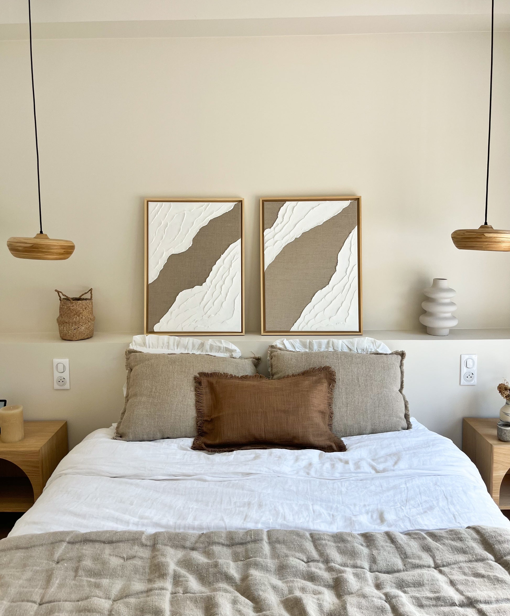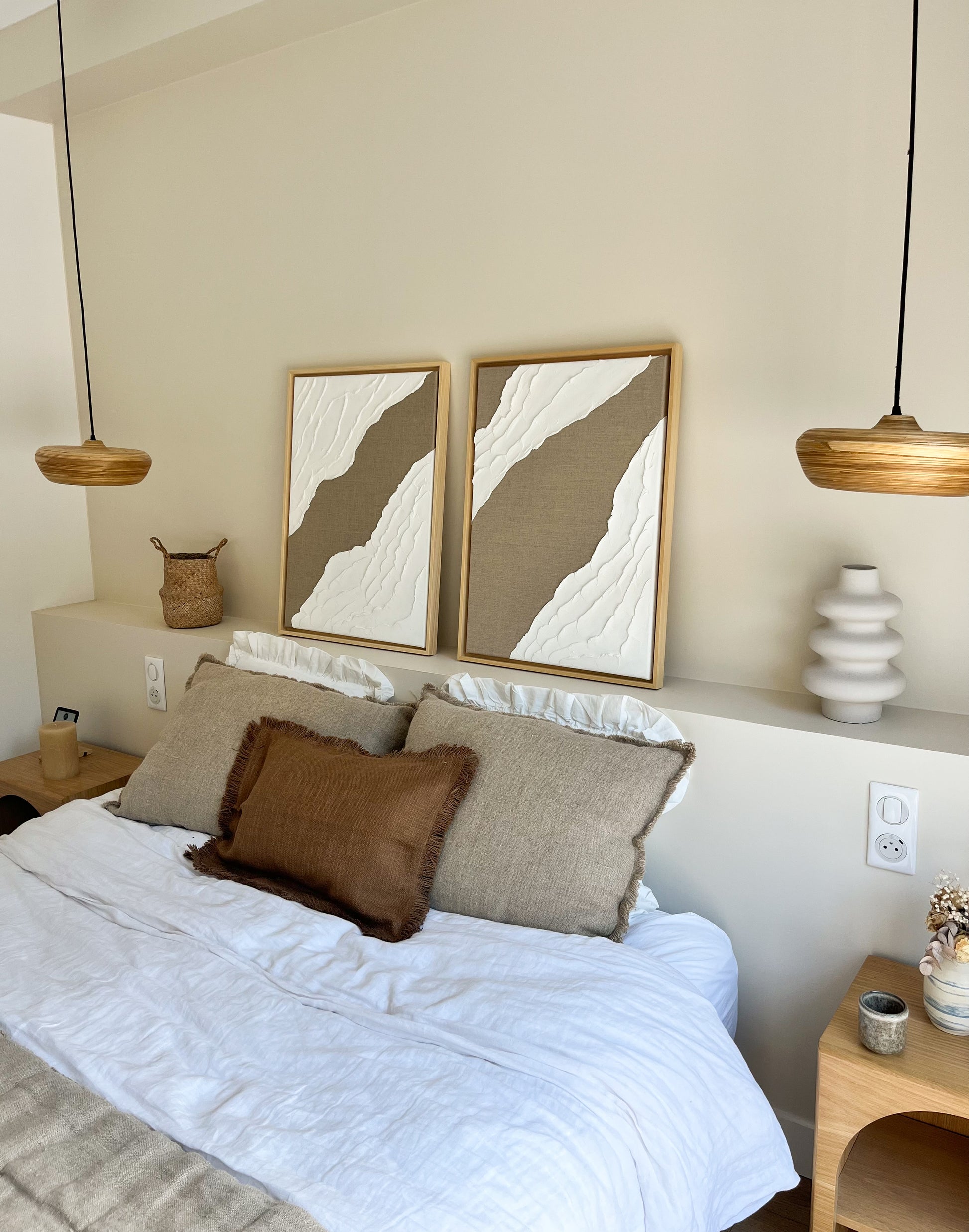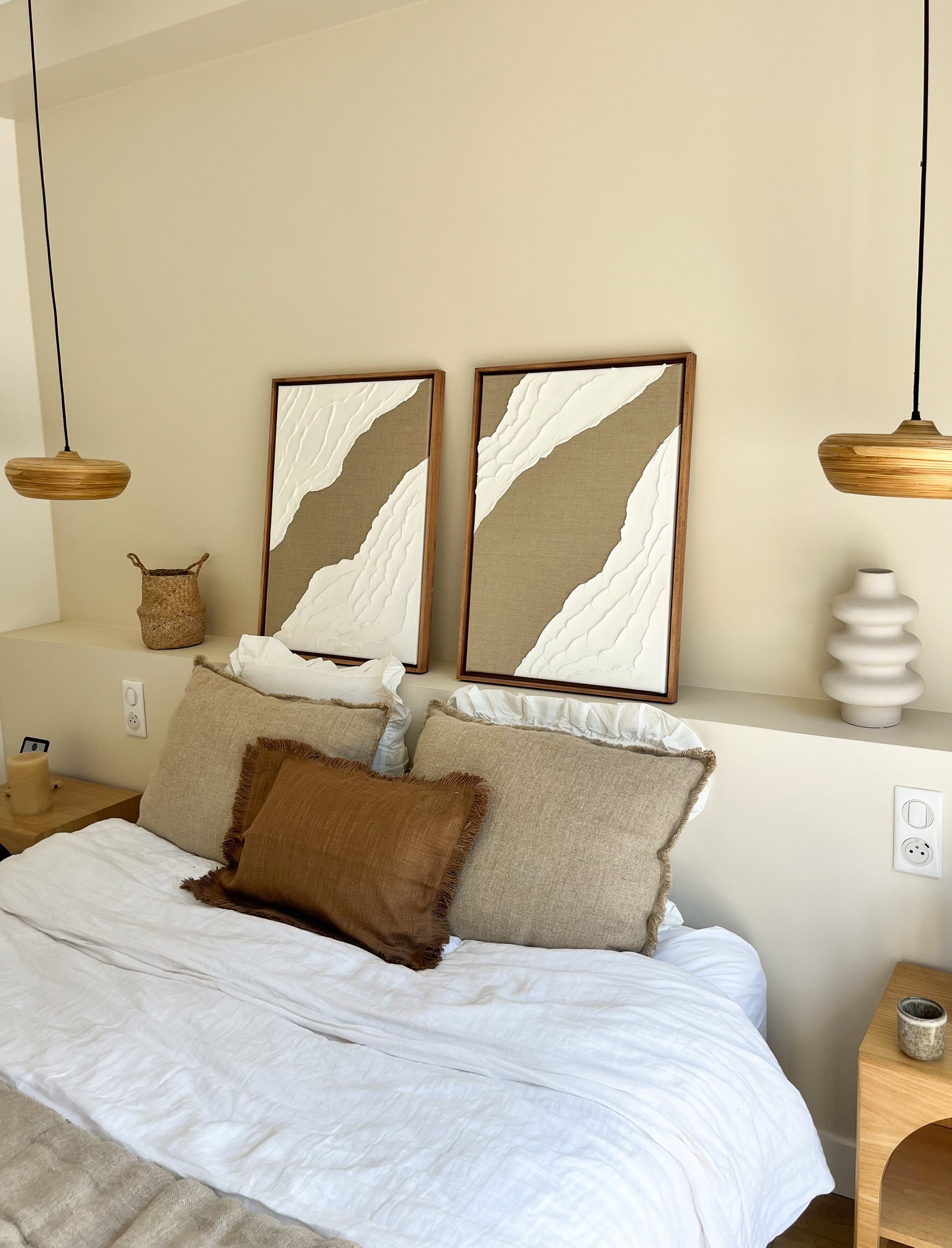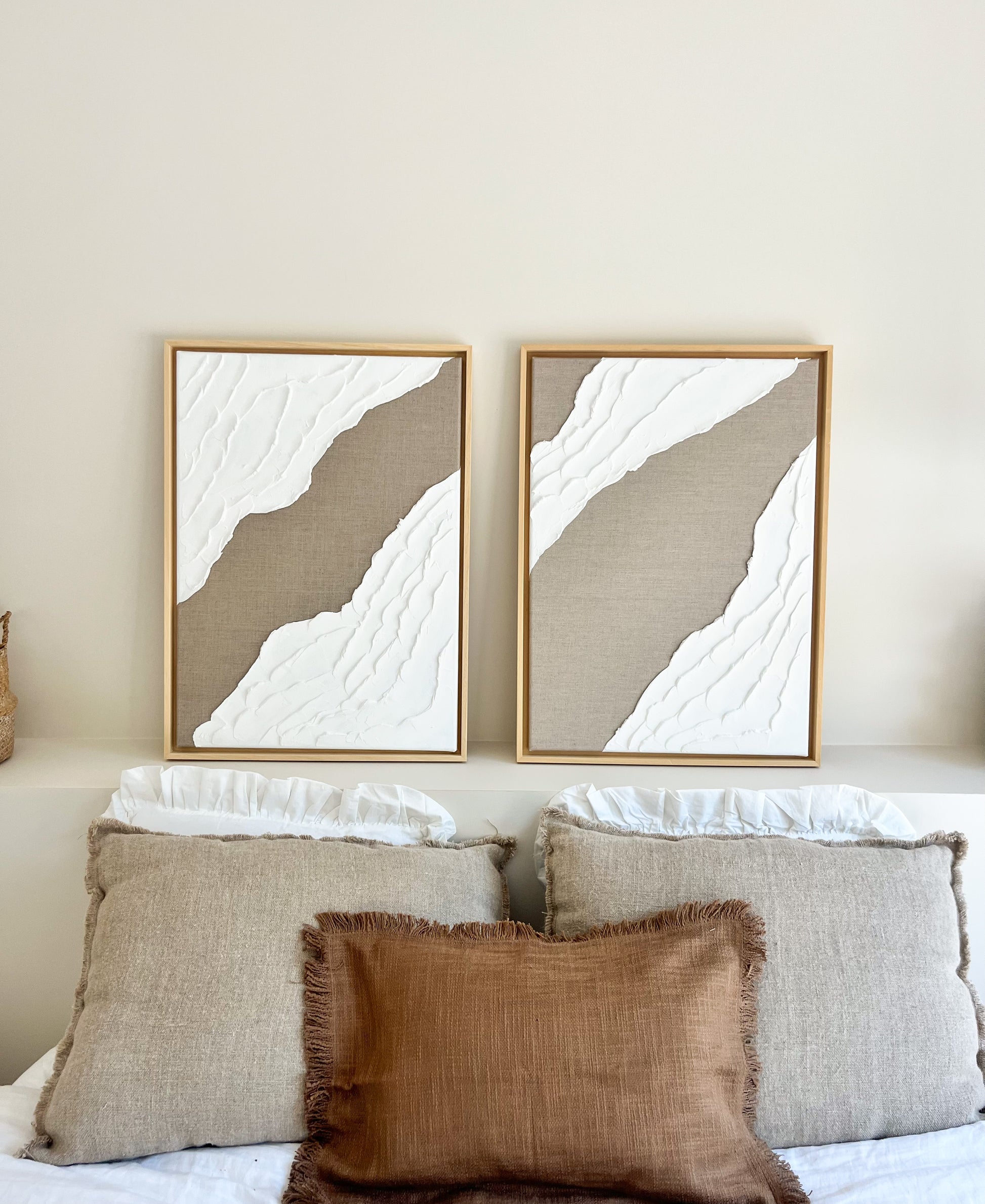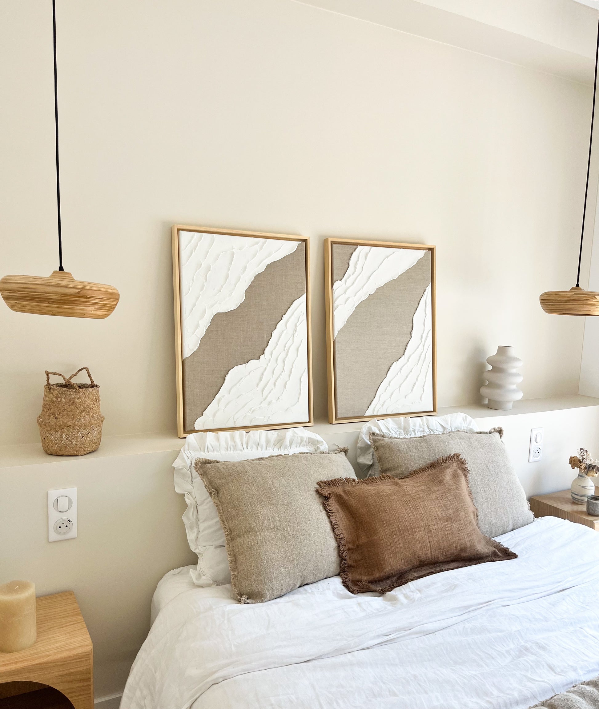 Couleurs : fond toile en lin et relief blanc grainé (effet sableux)